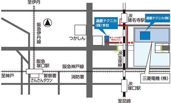 名神高速尼崎ICの出口から山手幹線を東に進み、久々知交差点を左折、尼崎池田線(産業道路)を北へ進み、塚口本町6北交差点を右折。名神高速尼崎ICより約10分。